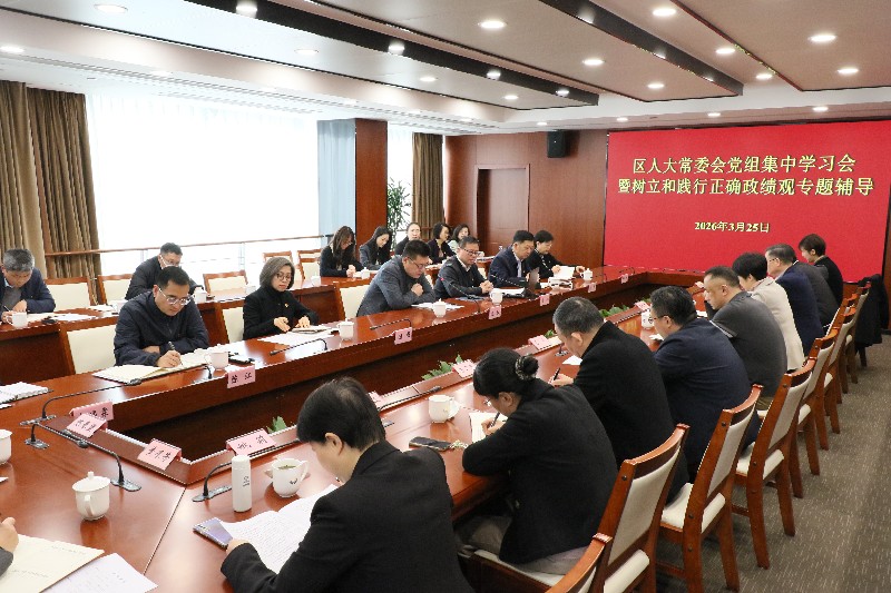2026年3月25日上午,区人大常委会党组开展集中学习,邀请区委党校讲师梁浩作《树立和践行正确政绩观,真抓实干推动“一地三区”建设》专题辅导报告。区人大常委会党组书记、主任沈权主持会议并讲话,党组副书记、副主任顾瑾,党组成员、副主任陈杰、陈江、邵琦出席会议。